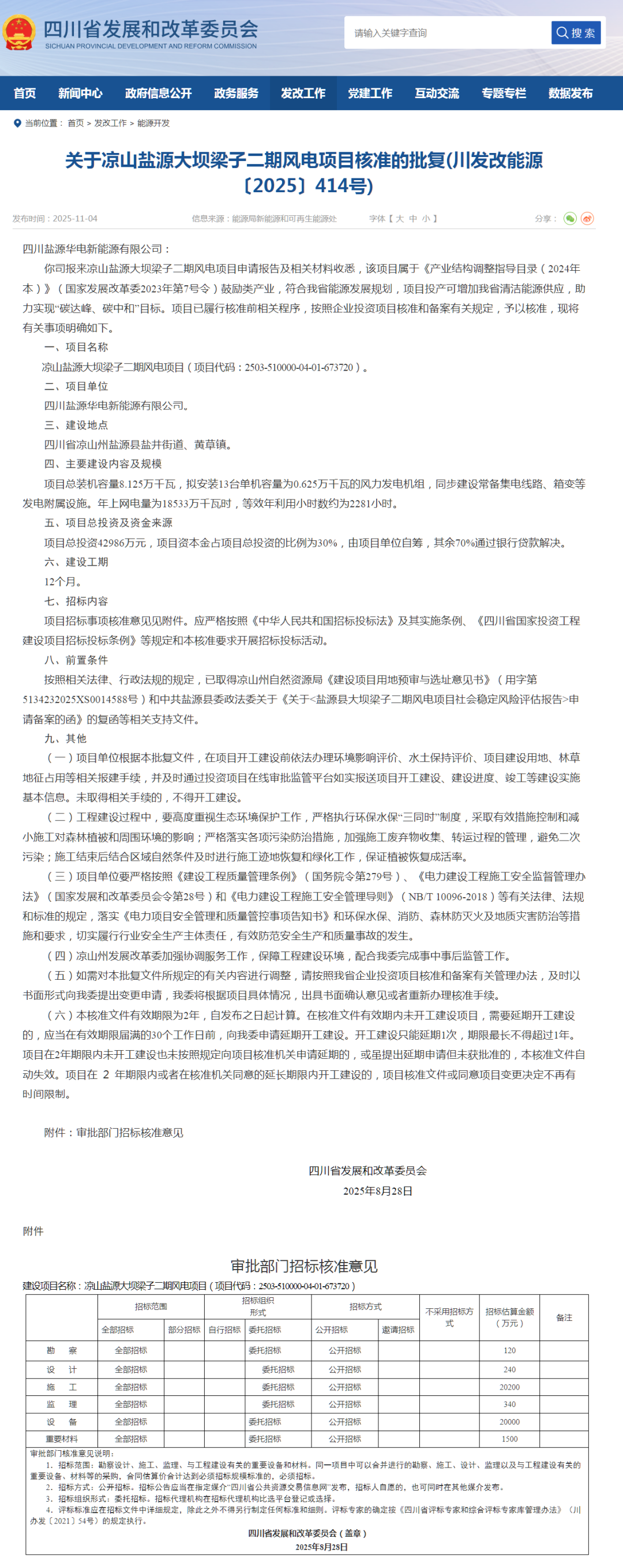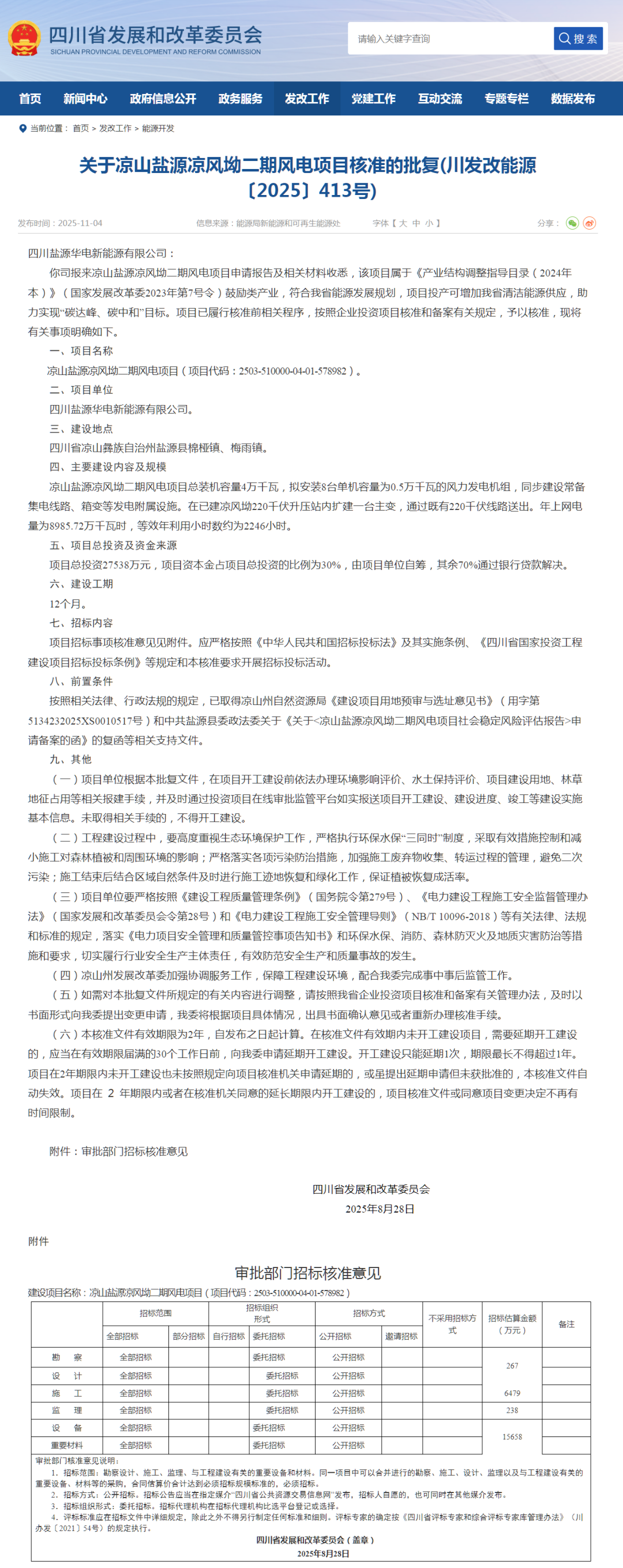 凉山盐源凉风坳二期风电项目位于四川省凉山彝族自治州盐源县棉桠镇、梅雨镇,项目单位为四川盐源华电新能源有限公司,项目总装机容量4万千瓦,拟安装8台单机容量为0.5万千瓦的风力发电机组,同步建设常备集电线路、箱变等发电附属设施。在已建凉风坳220千伏升压站内扩建一台主变,通过既有220千伏线路送出。年上网电量为8985.72万千瓦时,等效年利用小时数约为2246小时。项目总投资27538万元。