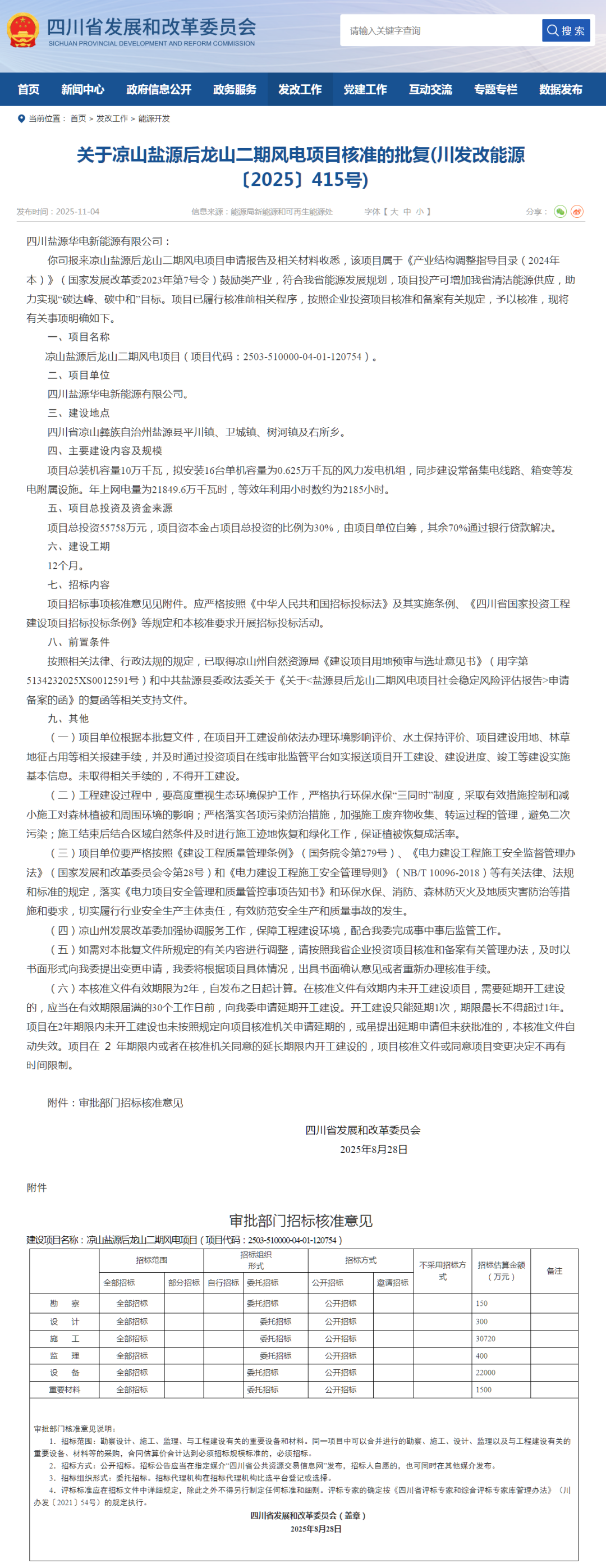 凉山盐源后龙山二期风电项目位于四川省凉山彝族自治州盐源县平川镇、卫城镇、树河镇及右所乡,项目单位为四川盐源华电新能源有限公司,项目总装机容量10万千瓦,拟安装16台单机容量为0.625万千瓦的风力发电机组,同步建设常备集电线路、箱变等发电附属设施。年上网电量为21849.6万千瓦时,等效年利用小时数约为2185小时。项目总投资55758万元。
