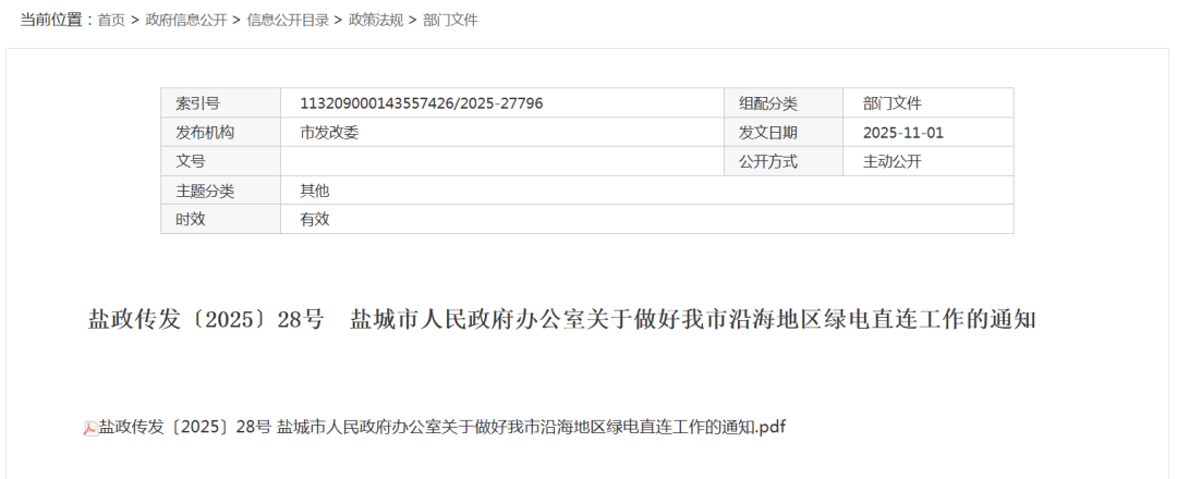 11月3日,江苏盐城市人民政府发布《关于做好我市沿海地区绿电直连工作的通知》。