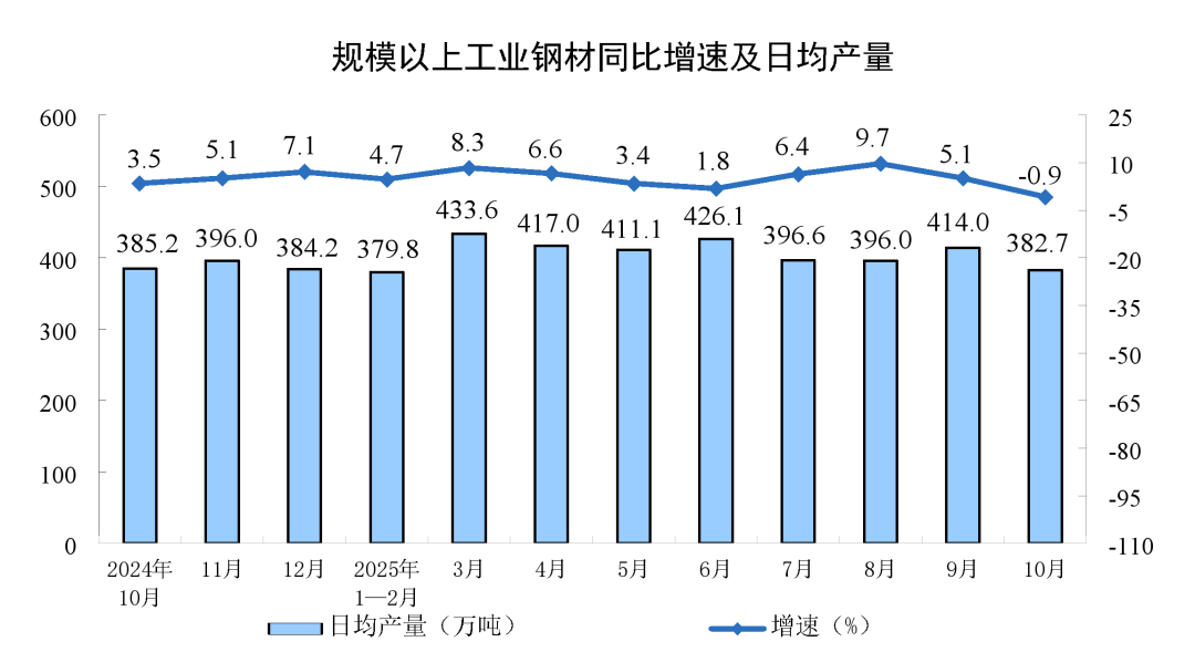分产品看,10月份,规模以上工业623种产品中有313种产品产量同比增长。其中,钢材11864万吨,同比下降0.9%;水泥14775万吨,下降15.8%;十种有色金属695万吨,增长2.9%;乙烯314万吨,增长11.7%;汽车327.9万辆,增长11.2%,其中新能源汽车171.0万辆,增长19.3%;发电量8002亿千瓦时,增长7.9%;原油加工量6343万吨,增长6.4%。10月份,规模以上工业企业产品销售率为96.4%,同比下降1.0个百分点;规模以上工业企业实现出口交货值13245亿元,同比名义下降2.1%。