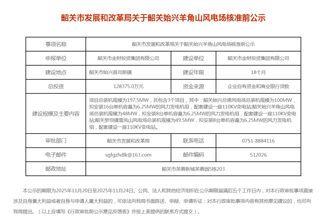韶关始兴羊角山风电场建设单位为韶关市金财投资集团有限公司,建设地点位于韶关市始兴县司前镇,总投资128375万元,建设年限18个月。项目总装机规模为197.5MW,共包含3个项目,其中:韶关始兴总甫风电场总装机规模为100MW,拟安装16台单机容量为6.25MW的风力发电机组,配套建设一座110KV变电站;韶关始兴羊角山风电场总装机规模为48MW,拟安装8台单机容量为6.25MW的风力发电机组,配套建设一座110KV变电站;韶关罗坝镇雪凤山风电场总装机规模为49.5MW,拟安装8台单机容量为6.25MW的风力发电机组,配套建设一座110KV变电站。