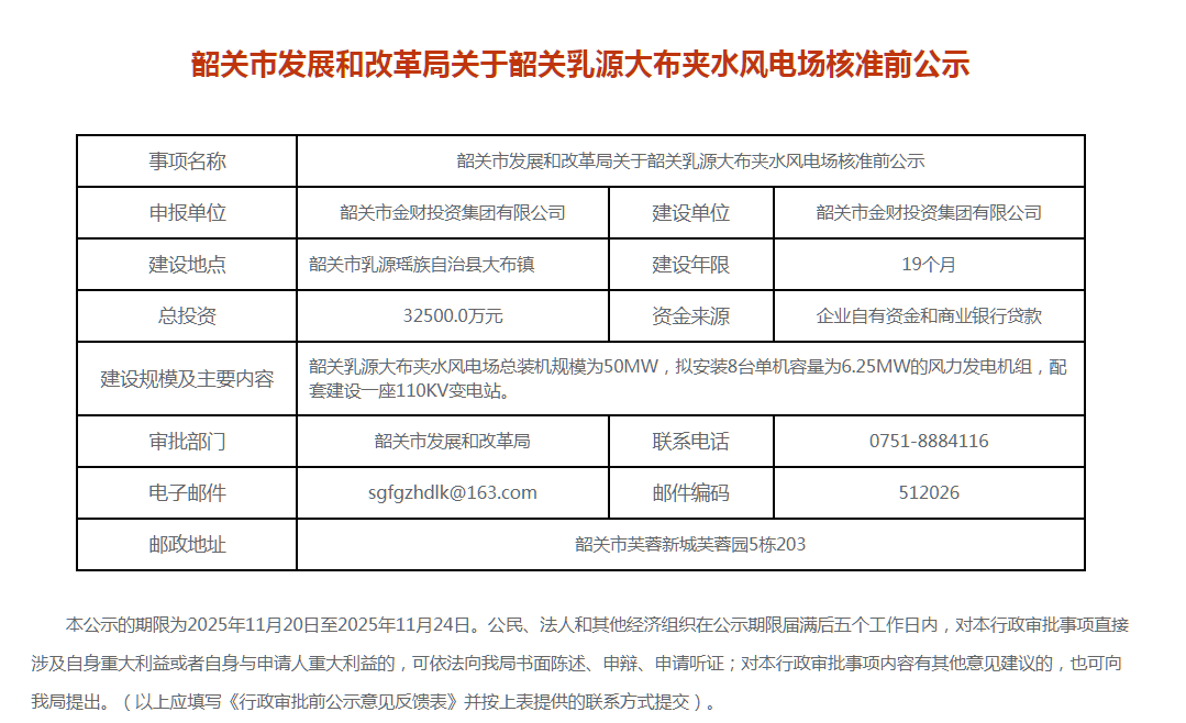 韶关乳源大布夹水风电场建设单位为韶关市金财投资集团有限公司,建设地点位于韶关市乳源瑶族自治县大布镇,总投资32500万元,建设年限19个月。总装机规模为50MW,拟安装8台单机容量为6.25MW的风力发电机组,配套建设一座110KV变电站。