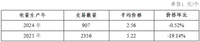 2025年10月,电量生产年为2024年的绿证单独交易平均价格2.56元/个,电量生产年为2025年的绿证单独交易平均价格5.22元/个。