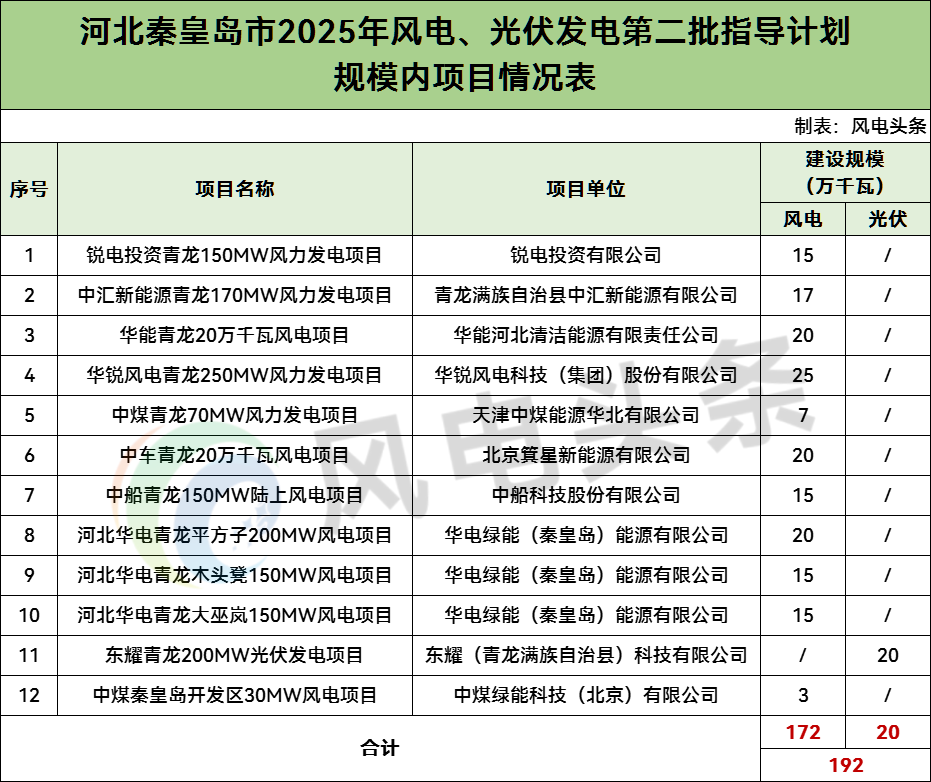 根据公示,共12个风光项目,规模合计192万千瓦,其中,风电项目11个,规模合计172万千瓦,光伏项目1个,规模合计20万千瓦。