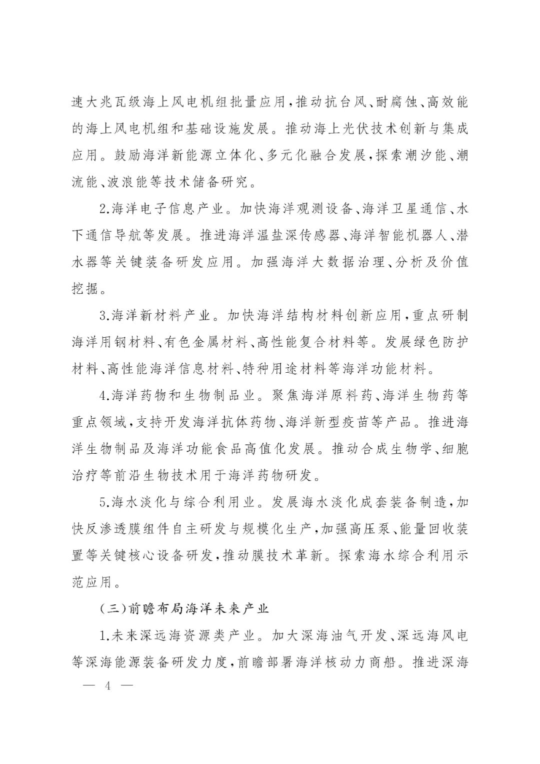 海洋新能源产业。推动海上风机整机及配套设备研制,加速大兆瓦级海上风电机组批量应用,推动抗台风、耐腐蚀、高效能的海上风电机组和基础设施发展。推动海上光伏技术创新与集成应用。鼓励海洋新能源立体化、多元化融合发展,探索潮汐能、潮流能、波浪能等技术储备研究。