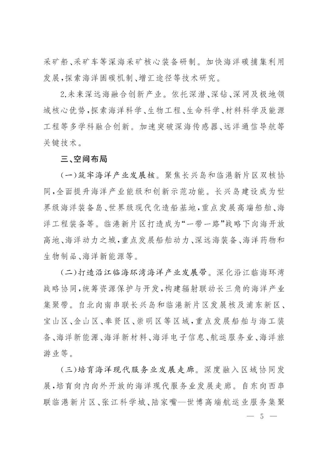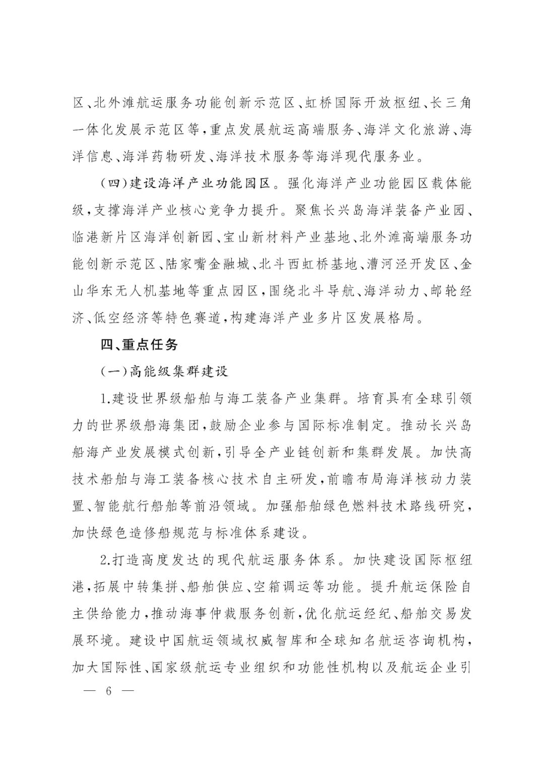 筑牢海洋产业发展核。聚焦长兴岛和临港新片区双核协同,全面提升海洋产业能级和创新示范功能。长兴岛建设成为世界级海洋装备岛、世界级现代化造船基地,重点发展高端船舶、海洋工程装备等。临港新片区打造成为“一带一路”战略下向海开放高地、海洋动力之城,重点发展船舶动力、深远海装备、海洋药物和生物制品、海洋新能源等。
