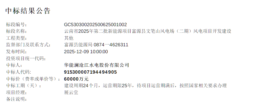 根据公示,富源县光梁子风电场(二期)、文笔山风电场(二期)风电项目中标人均为华能澜沧江水电股份有限公司,母公司为华能。