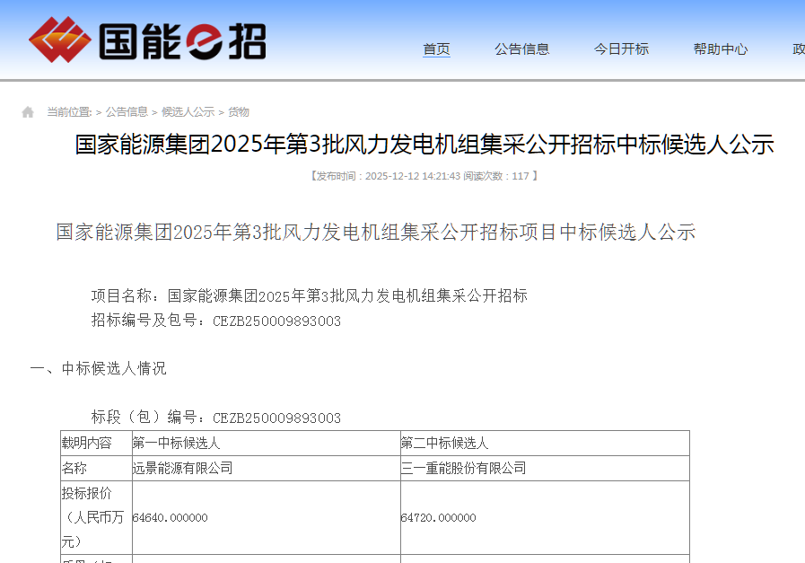 新能源圈获悉,12月12日,国家能源集团2025年第3批风力发电机组集采公开招标中标候选人公示。