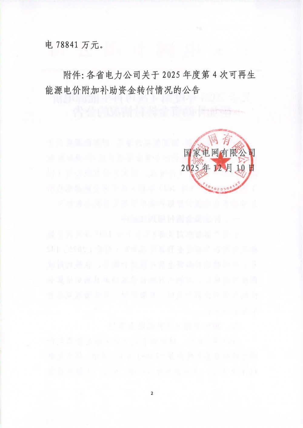 12月12日,国家电网有限公司发布关于2025年度第4次可再生能源电价附加补助资金转付情况的公告。