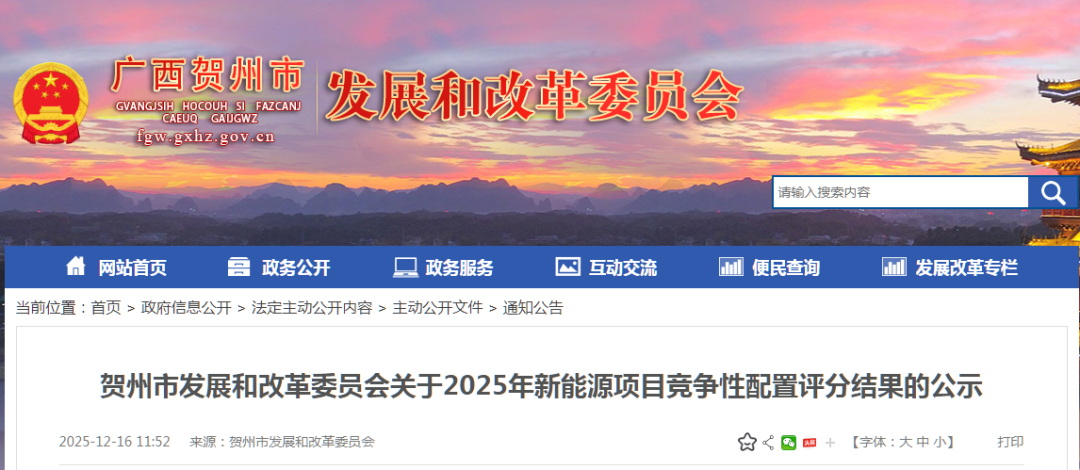 贺州市发展和改革委员会关于2025年新能源项目竞争性配置评分结果的公示