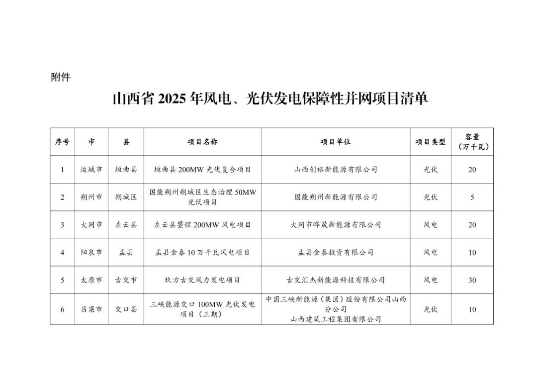 山西省能源局关于下达山西省2025年风电、光伏发电保障性并网年度建设计划的通知