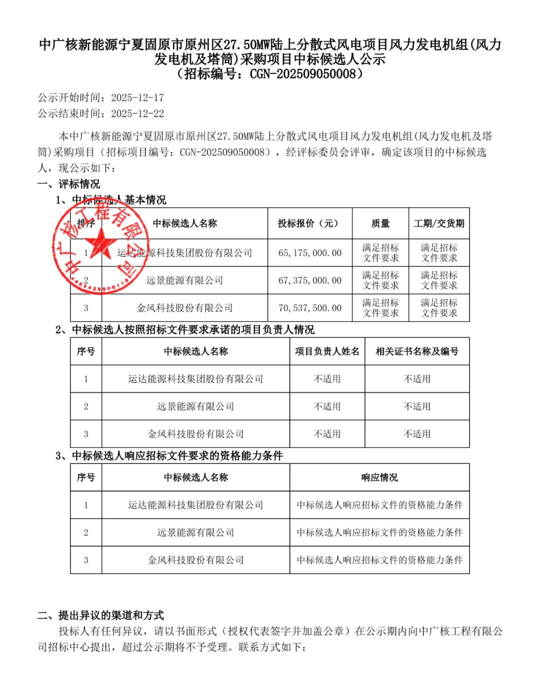 新能源圈获悉,12月17日、18日,国家能源集团2025年第3批风力发电机组集采-标包一、国家能源集团2025年第2批风力发电机组集采-标包一、中广核新能源宁夏固原市原州区27.50MW陆上分散式风电项目风力发电机组采购中标候选人公示,规模合计1577.5MW。