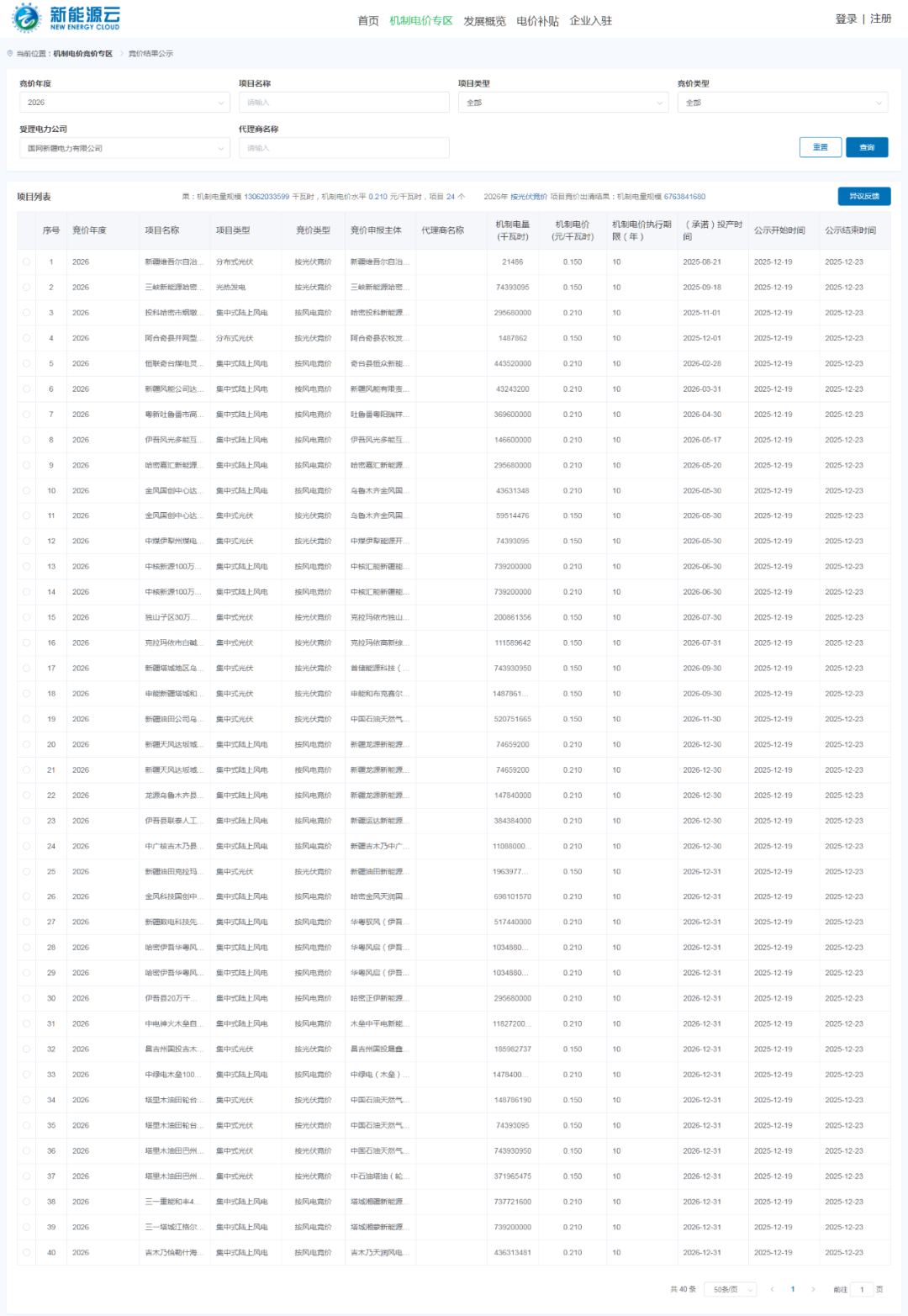 新能源圈获悉,12月19日,国网新能源云公示新疆2026年风、光项目机制电价竞价结果。
