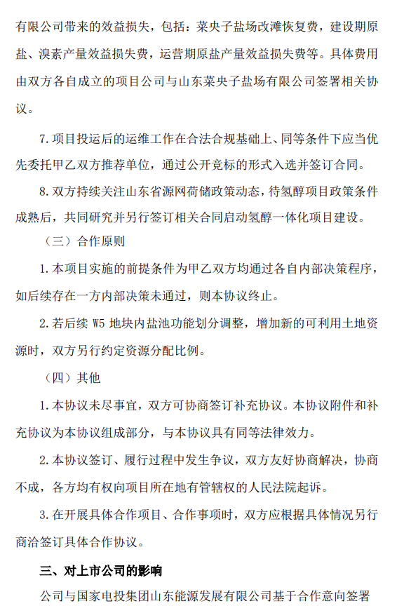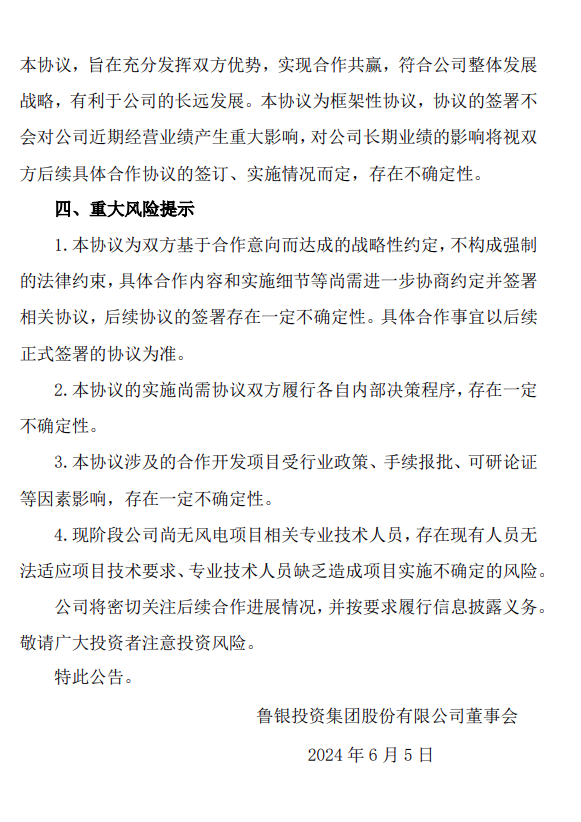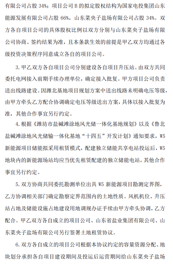 2024-04-30 6月5日,鲁银投资与国家电投集团山东能源发展有限公司签署《鲁北盐碱滩涂地风光储输一体化基地W5地块项目框架合作协议》。