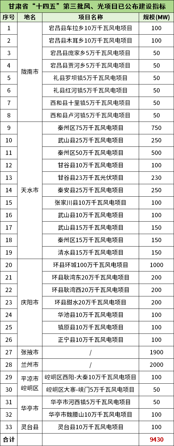 据了解,甘肃目前已有陇南、天水、庆阳、张掖、兰州、平凉市崆峒区、华亭市、灵台县8地下发“十四五”第三批新能源项目竞配方案,规模累计达9430MW。