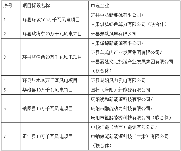 正宁县10万千瓦风电项目中选企业为中核汇能(陕西)能源有限公司/中钠储能新能源科技(甘肃)有限公司(联合体)。