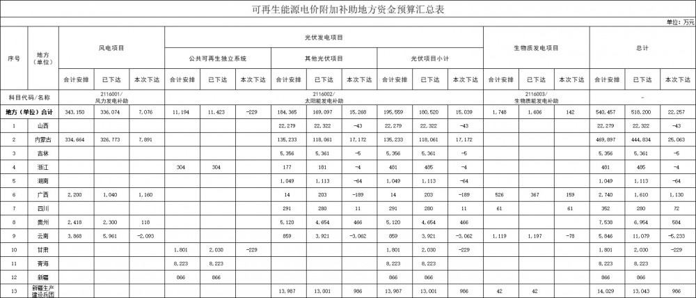 据悉,6月20日,财政部发布《关于下达2024年可再生能源电价附加补助地方资金预算的通知》。