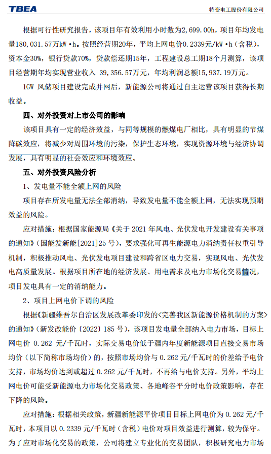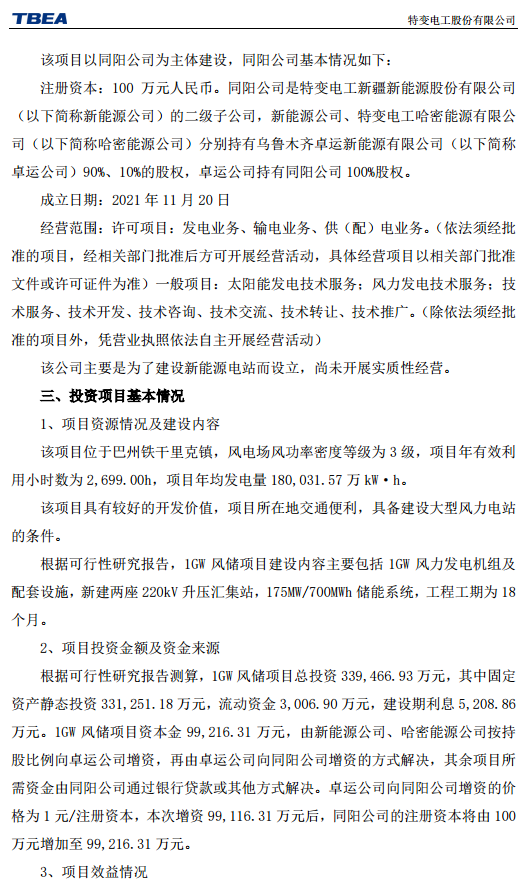 公告称,为抢抓市场机遇,加快风光资源的开发,公司控股公司同阳新能源有限公司(简称同阳公司)投资建设1GW风储项目,项目总投资为339,466.93万元。该项目已获得新疆维吾尔自治区发展和改革委员会《关于印发新增政策性开发性金融工具支持市场化并网新能源项目清单有关事宜的通知》(新发改能源〔2022〕465 号)。
