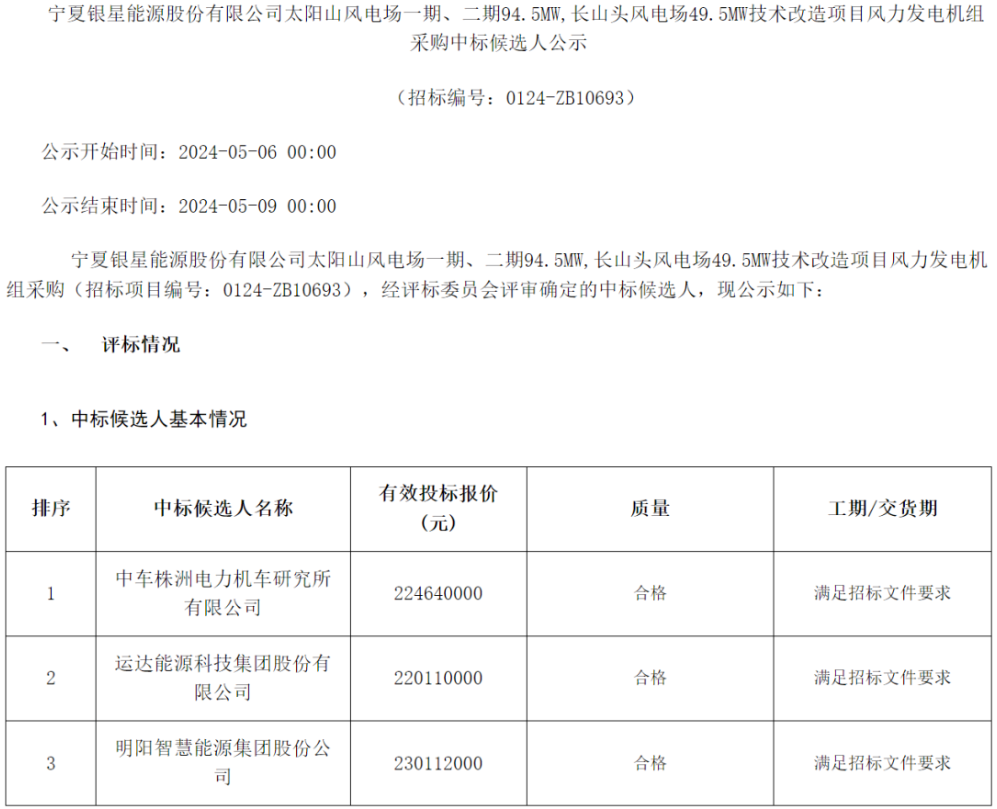 2024-04-30 据新能源圈了解到,近日,中铝集团电子招投标平台发布宁夏银星能源股份有限公司太阳山风电场一期、二期94.5MW,长山头风电场49.5MW技术改造项目风力发电机组采购中标候选人,中车株洲所、运达股份、明阳智能3家整机商入选。