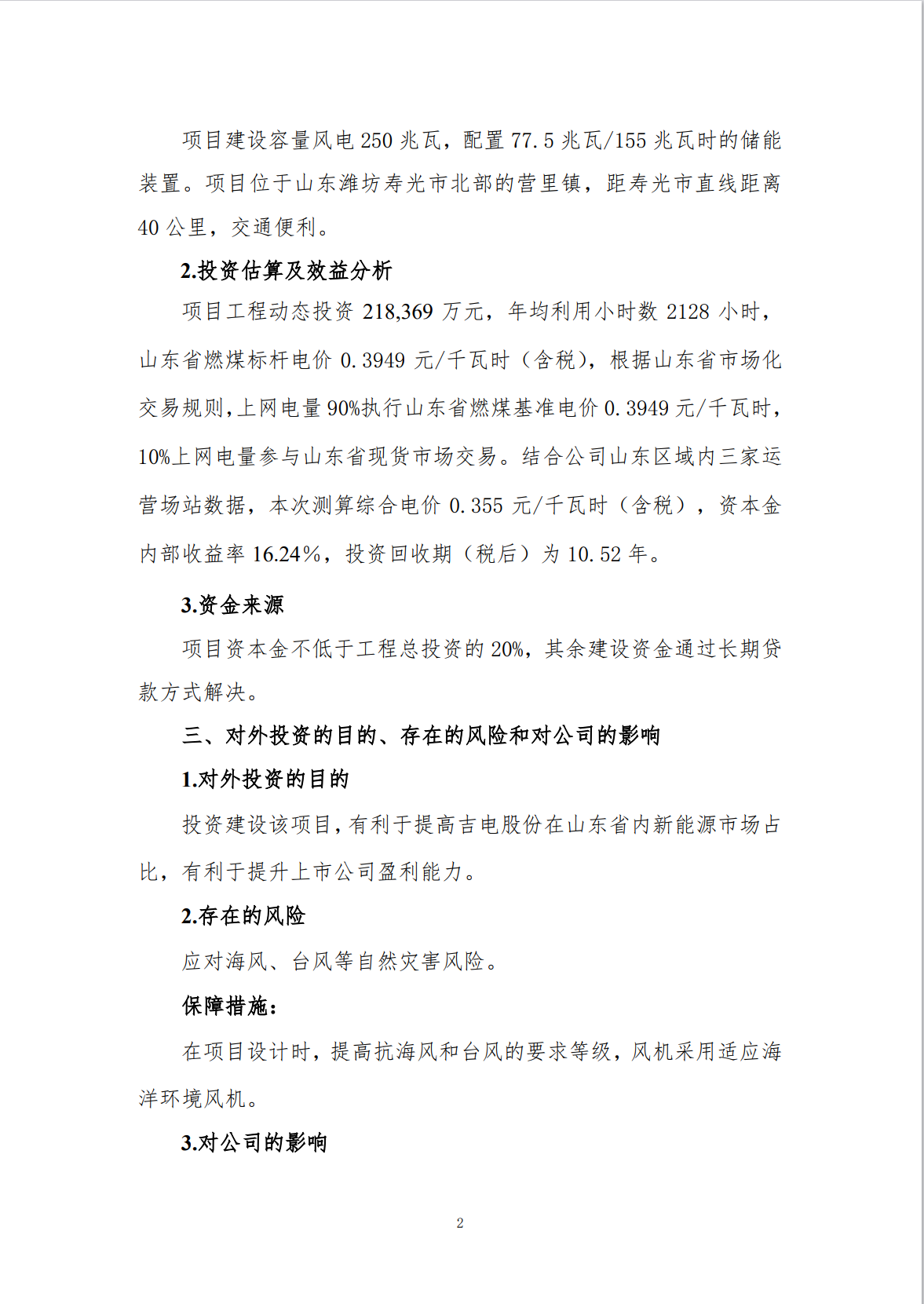2024-04-30 据新能源圈了解到,4月29日,吉电股份发布公告称,为促进公司可持续发展,持续提升公司盈利能力,公司全资子公司山东吉电新能源有限公司控股子公司山东盛吉新能源有限公司的全资子公司吉电(潍坊)新能源科技有限公司拟投资建设山东潍坊风光储多能互补试点项目首批二期250兆瓦风电项目,该项目工程动态投资218,369万元。