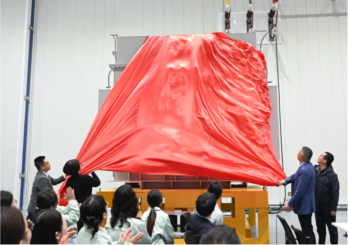 在产品下线仪式上,金盘科技董事长李志远先生、境外子公司总裁靖宇清女士、公司副总经理邸双奎先生、智能科技研究总院院长耿潇先生共同为公司 20+MW 等级大容量海上风电机舱变产品揭幕。