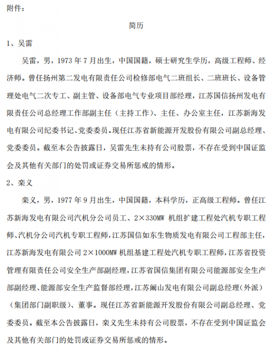 公告称,5月10日,江苏新能以通讯表决的方式召开了第三届董事会第三十二次会议,会议审议通过了《关于聘任副总经理的议案》,同意聘任吴雷先生、栾义先生担任公司副总经理,任期自董事会审议通过之日起至第三届董事会届满为止。