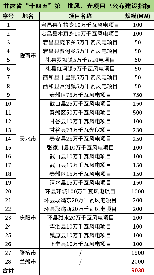 /风电头条(wind-2005s)通过梳理,截止到目前,天水、兰州、张掖、庆阳、陇南五地下发“十四五”第三批新能源项目竞配方案,规模累计达9030MW。