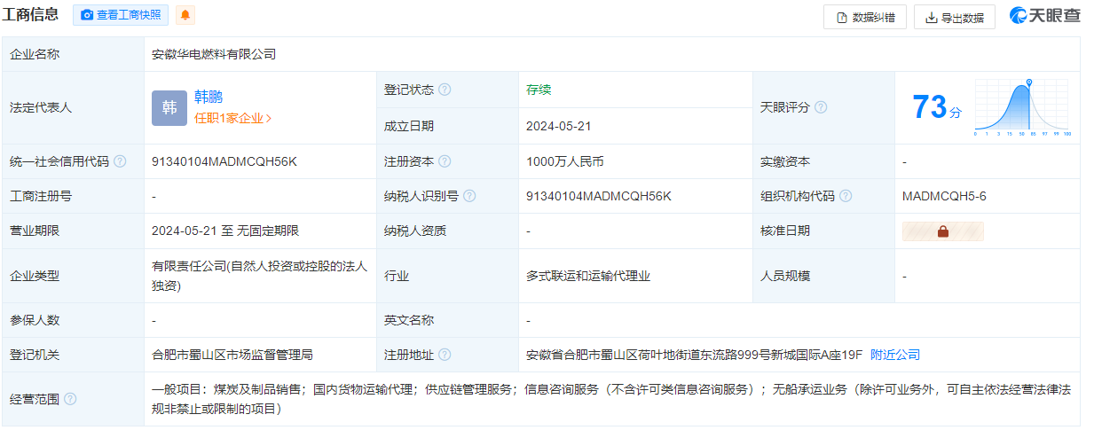 能源圈网获悉 据天眼查显示,5月21日,安徽华电燃料有限公司成立,注册资本1000万元,经营范围包含:煤炭及制品销售;国内货物运输代理;供应链管理服务;无船承运业务等。据悉,该公司由华电国际全资持股。