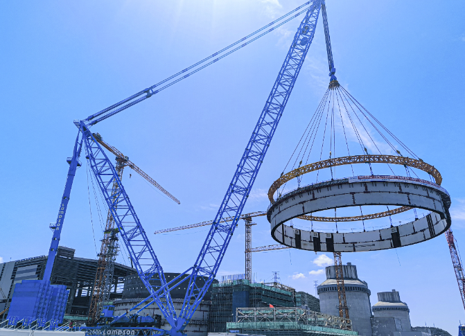 5月29日15时30分,中核机械工程圆满完成三门核电二期3#机组核岛屏蔽厂房墙体钢板混凝土结构(SC)6-7层模块的吊装作业。这一创新突破标志着CAP1000系列屏蔽厂房首次实现整圈吊装,为3号机组安全壳顶封头的就位奠定了坚实的基础,整个吊装过程历时3时44分,过程安全可控,运行平稳。