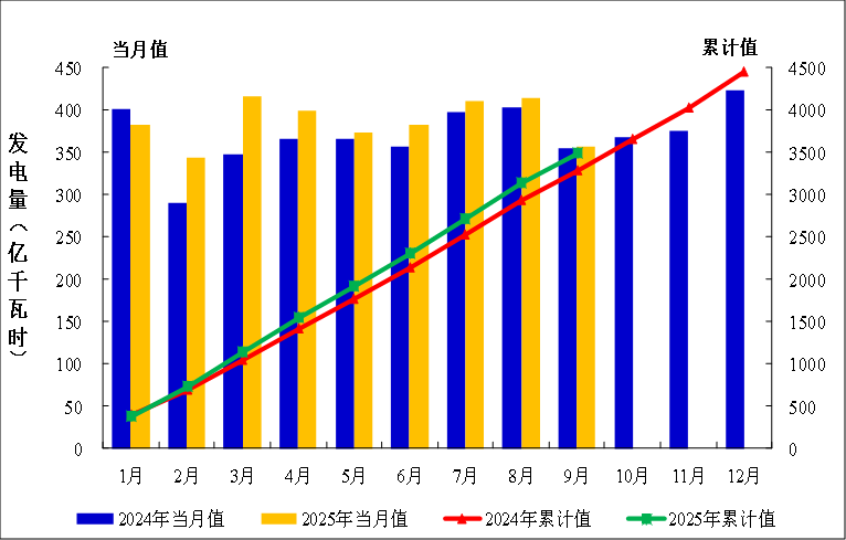 图2:2024年1月至2025年9月全国运行核电机组发电量趋势