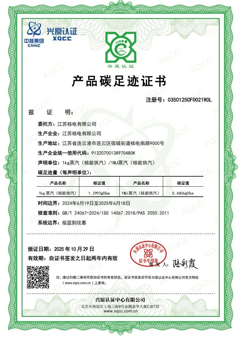 本次发布以江苏核电和气一号投产一周年为核算周期,按照国内国际产品碳足迹量化标准进行测算。数据显示,核能供汽碳足迹是燃煤热电联产蒸汽的1/600,是天然气热电联产蒸汽的1/100;核能供汽比化工蒸汽低碳优势更突出,比天然气更绿色。