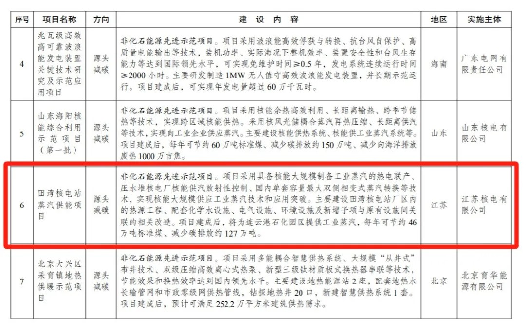 田湾核电蒸汽供能项目是全国首个核能与化工行业耦合项目,采用田湾核电3、4号机组二回路蒸汽为热源,设计上采用了包括核电厂一回路、二回路及工业蒸汽回路等在内的多重隔离,在物理隔绝的情况下,采用多级换热技术,通过工业蒸汽管网将1.8MPa、248℃、600t/h的蒸汽,经由独立隔离回路输送至连云港石化产业基地。该项目于2022年5月27日开工,预计2024年6月建成,每年可为连云港石化产业基地提供480万吨工业蒸汽,相当于每年减少燃烧标准煤40万吨,等效减排二氧化碳107万吨、二氧化硫184吨、氮氧化物263吨,同时每年可为石化基地节省70多万吨碳排放指标,提供了更多的环境空间,将有效支撑地方石化产业的转型升级。