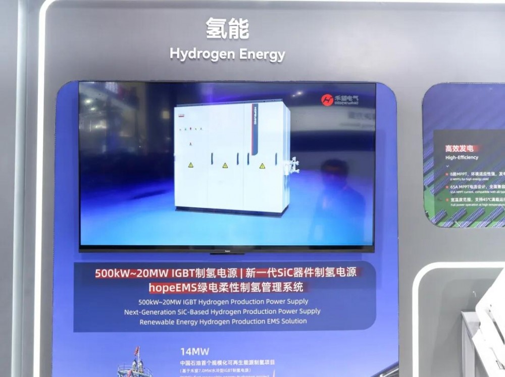 氢能展区内,禾望电气的氢能沙盘吸引了众多观众驻足。作为新能源领域的重要方向,氢能是实现“双碳”目标的关键抓手。禾望电气积极布局氢能赛道,推出了500kW~20MW IGBT制氢电源、500kW~33MW晶闸管制氢电源以及新一代SiC制氢电源,目前已实现超100MW制氢电源实例应用。结合公司风光储电能变换与控制产品,以及hopeEMS绿电柔性制氢管理系统,提供风光储并/离网制氢电力系统一体化解决方案。