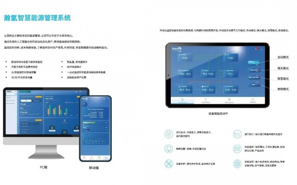 智慧氢能平台:智慧氢能平台是一个以氢能为核心的多能融合的综合解决方案,包括光伏逆变器、电解水制氢系统、储氢系统、燃料电池发电系统、辅助电能系统和协同控制模块。其工作原理是利用光伏产生的绿电电解水制氢并储存,储存的绿色氢气可以通过燃料电池发电转化回电力,制氢和发电过程产生的余热可作为热泵热源。