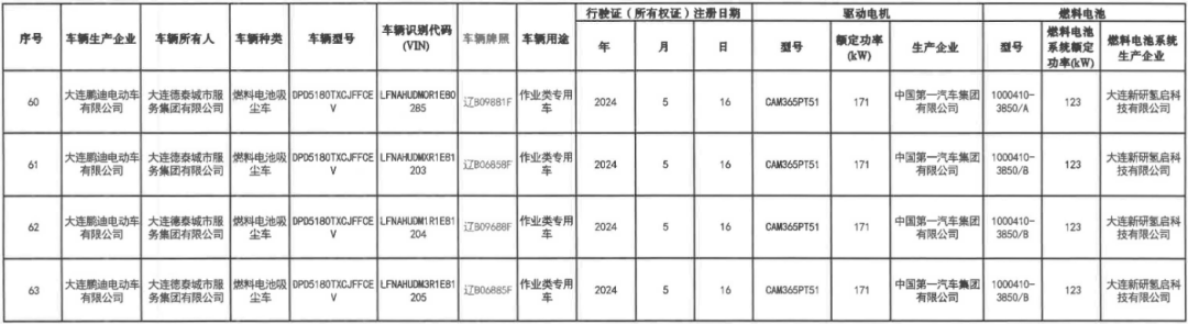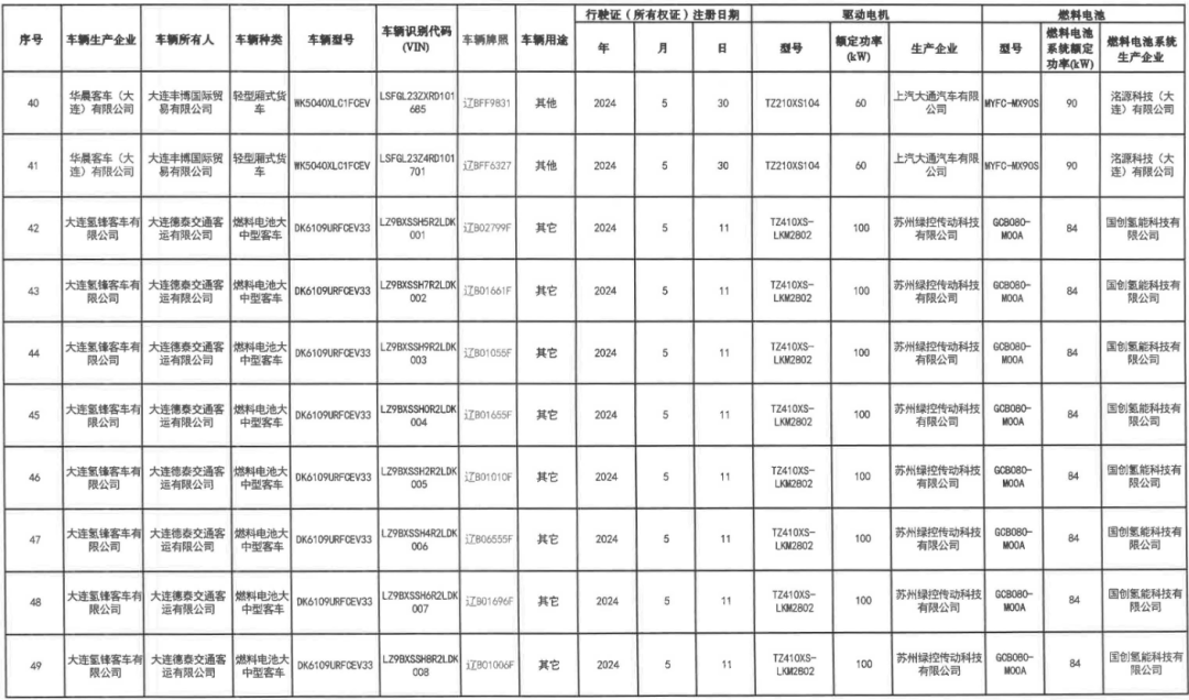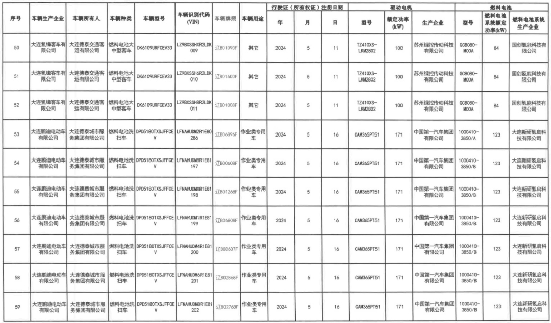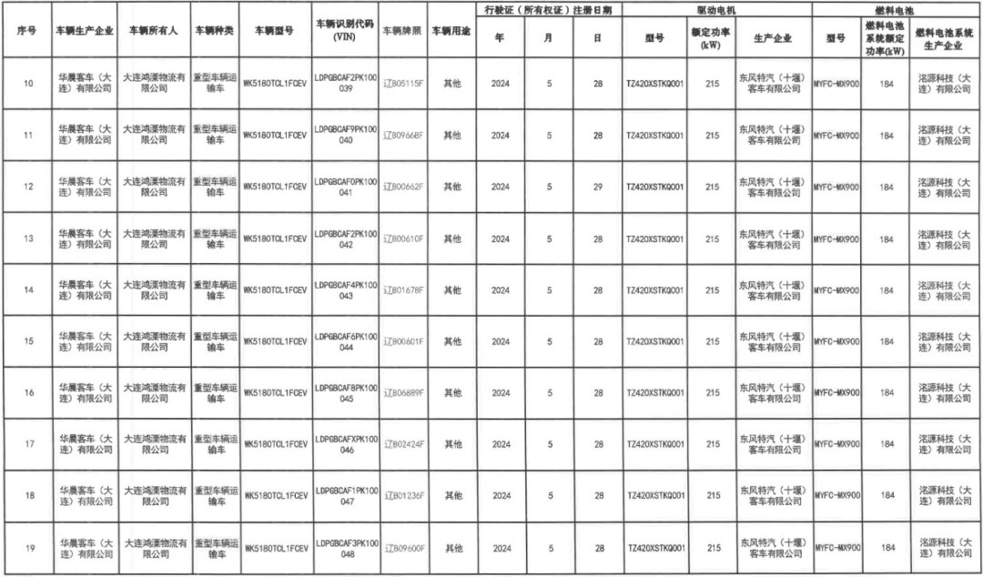 车辆种类涉及重型车辆运输车、大型普通客车、轻型厢式货车、燃料电池大中型客车、燃料电池洗扫车、燃料电池吸尘车。