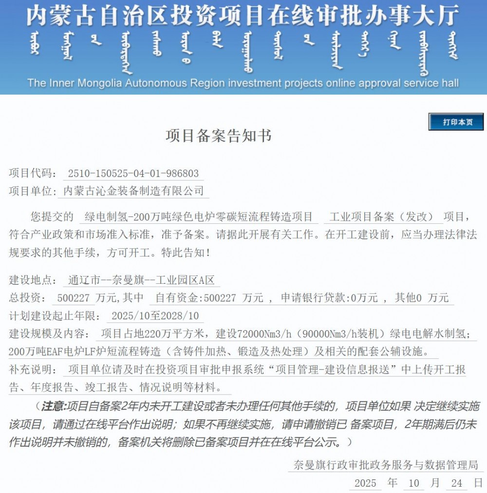 近日,绿电制氢-200万吨绿色电炉零碳短流程铸造项目获备案。