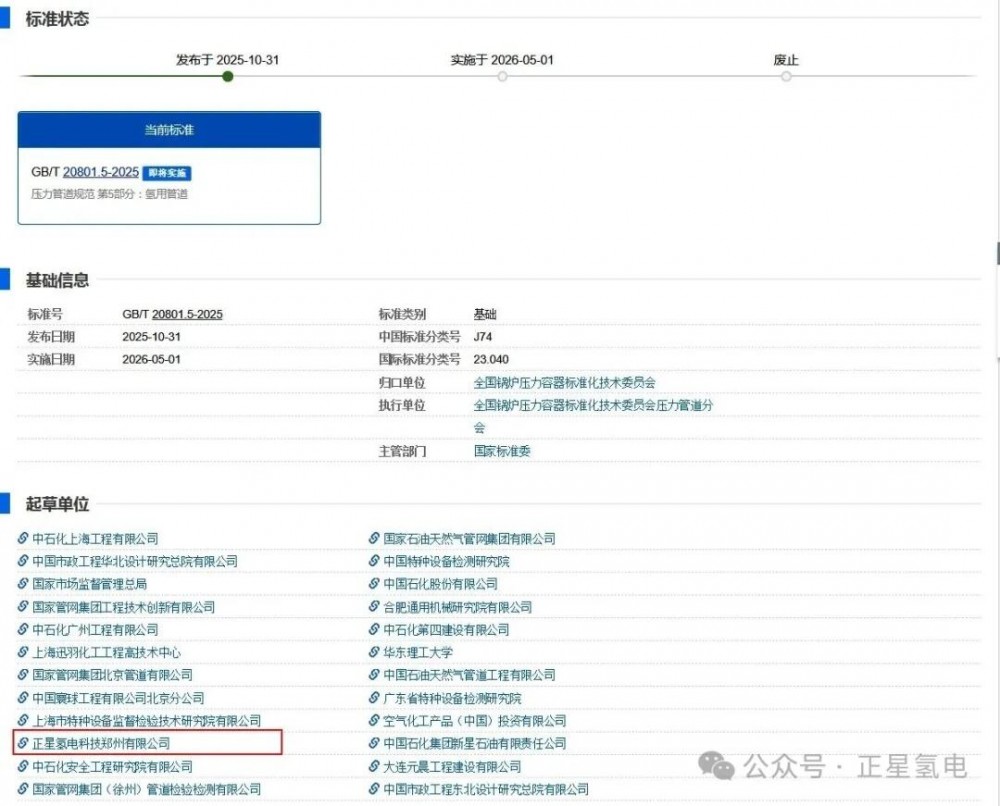 2025年10月31日,国家标准化管理委员会正式发布国家标准GB/T 20801.5-2025《压力管道规范 第 5 部分:氢用管道》(以下简称《标准》),该标准将于2026年5月1日起实施。