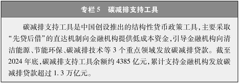 完善支持绿色低碳发展的经济政策。中国建立健全支持绿色低碳发展的财税价格政策。在政府采购中推行强制采购、优先采购节能环保产品,目前政府采购节能环保产品规模占同类产品采购规模的比例超过85%。完善绿色电价政策,优化绿色投资政策。健全绿色金融标准体系,实施碳减排支持工具等结构性货币政策工具。完善气候投融资政策体系,部署开展23个气候投融资地方试点,指导地方建设气候投融资项目库。截至2024年底,中国本外币绿色贷款余额36.6万亿元,投向具有碳减排效益的贷款占比接近七成。2024年,绿色保险业务保费收入达3331.49亿元;绿色债券发行量为6814.32亿元,是2020年的2.5倍。