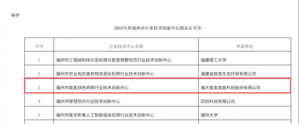 近日,福州市科学技术局发布《关于拟认定2025年度行业技术创新中心的公示》,福大紫金氢能科技股份有限公司成功获批认定“福州市氨氢绿色转换行业技术创新中心”。这是公司继获评福建省高新技术企业、专精特新中小企业、创新型中小企业、福州市知识产权优势企业后,在科技创新平台建设上的又一重要成果。