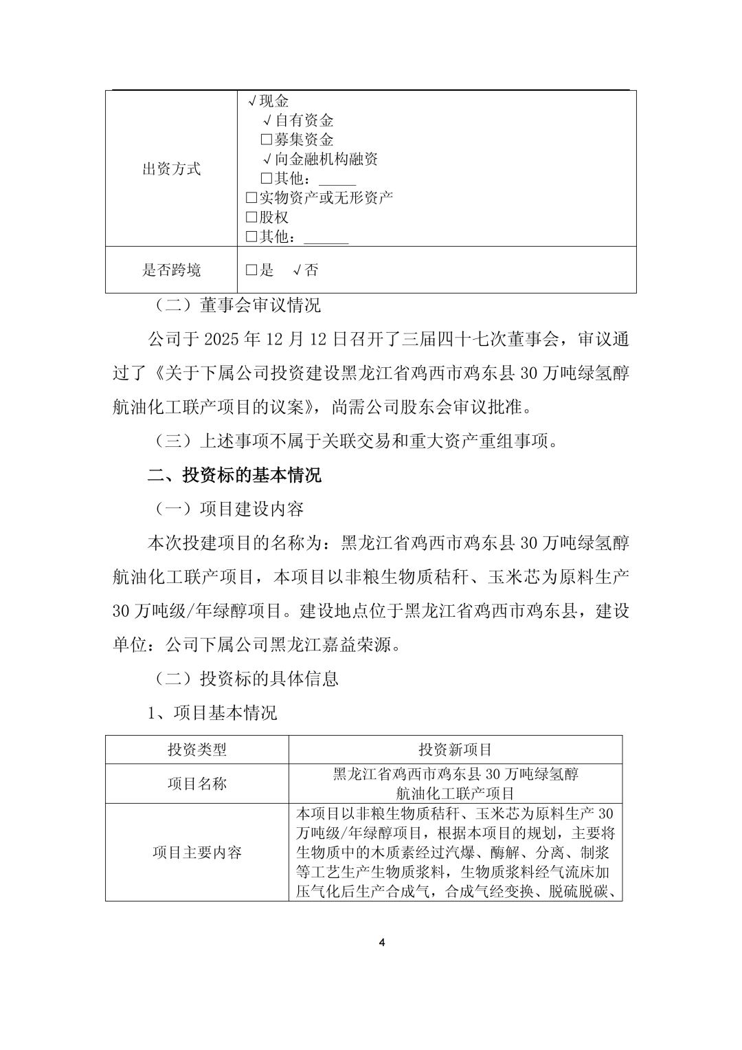 公告称,为满足公司生产经营和发展战略的需要,根据公司控股子公司上海嘉益荣源能源化工有限公司(以下简称“上海嘉益荣源”)与鸡西市人民政府签订的《鸡西市绿氢醇航油化工联产项目投资合同》,上海嘉益荣源全资子公司黑龙江嘉益荣源绿色化工有限公司(简称“黑龙江嘉益荣源”)拟采用自有和向金融机构融资等方式筹措资金,投资建设黑龙江省鸡西市鸡东县30万吨绿氢醇航油化工联产项目,上述绿氢醇项目计划总投资约355,660.38万元。