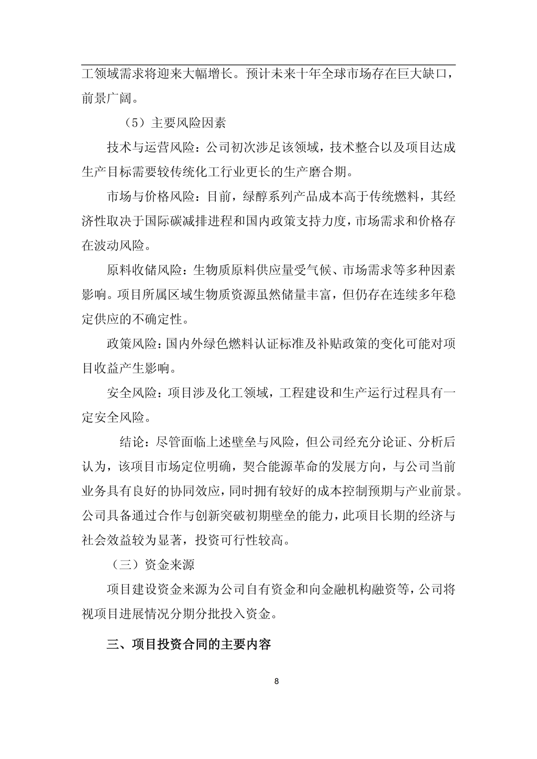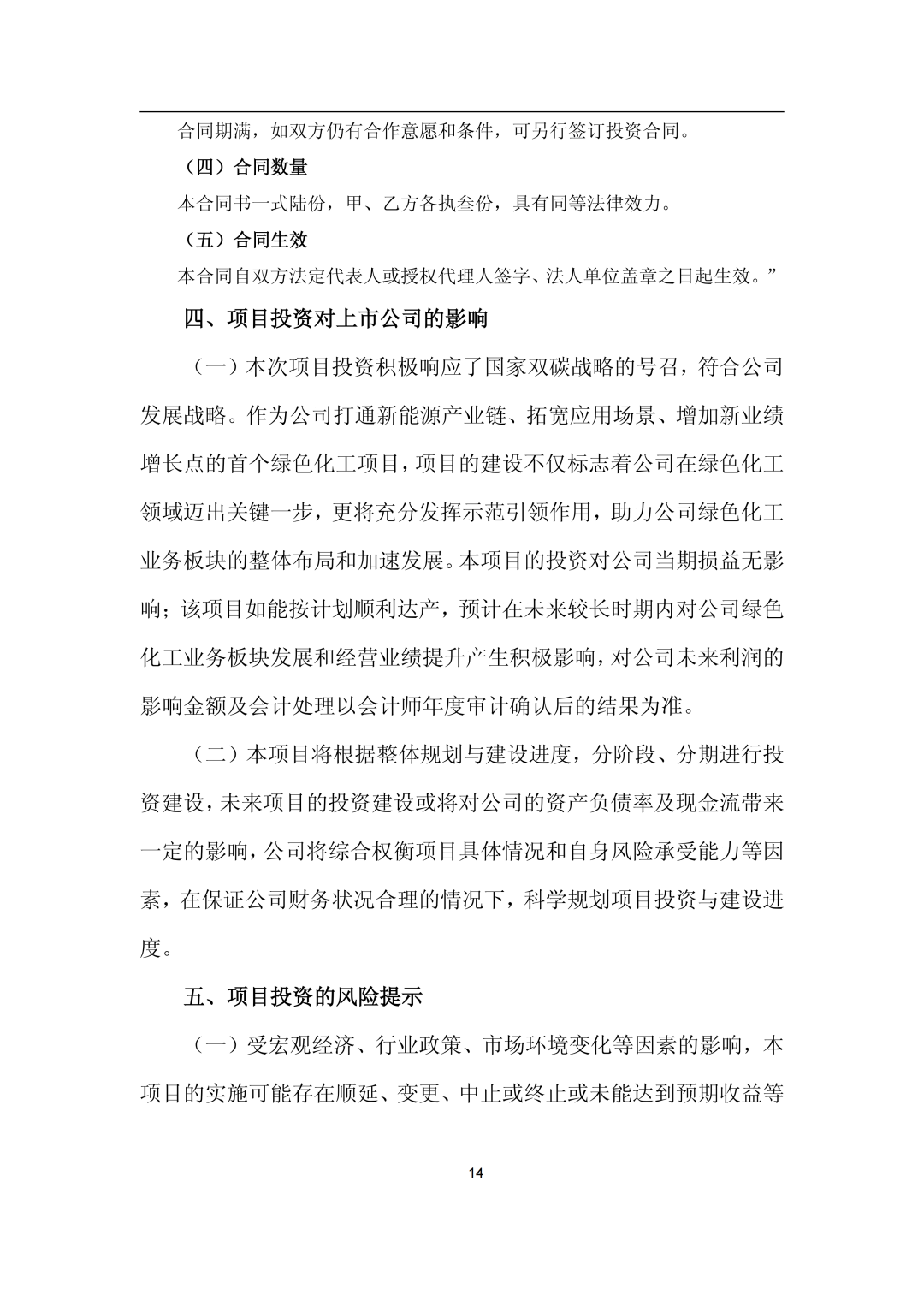 其中:一期项目计划2025-2027年投资建设,达到24万吨/年绿色甲醇、8万吨/年绿色乙醇或5万吨绿色航煤产能规模;二期项目视一期项目经营状况、产品市场开拓情况适时投资建设。