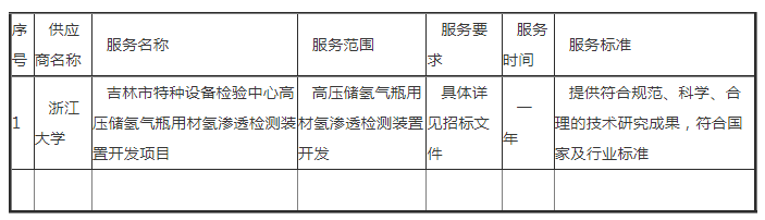 据悉,该公告内容明确指出,项目名称为吉林市特种设备检验中心高压储氢气瓶用材氢渗透检测装置开发项目,中标(成交)供应商为浙江大学,中标(成交)金额为138.9000000万元,服务范围为高压储氢气瓶用材氢渗透检测装置开发。