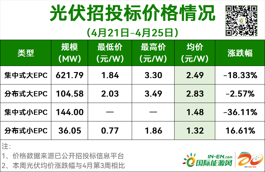 根据4月21日至4月25日光伏EPC市场情况,精选展示最高价以及最低价项目。