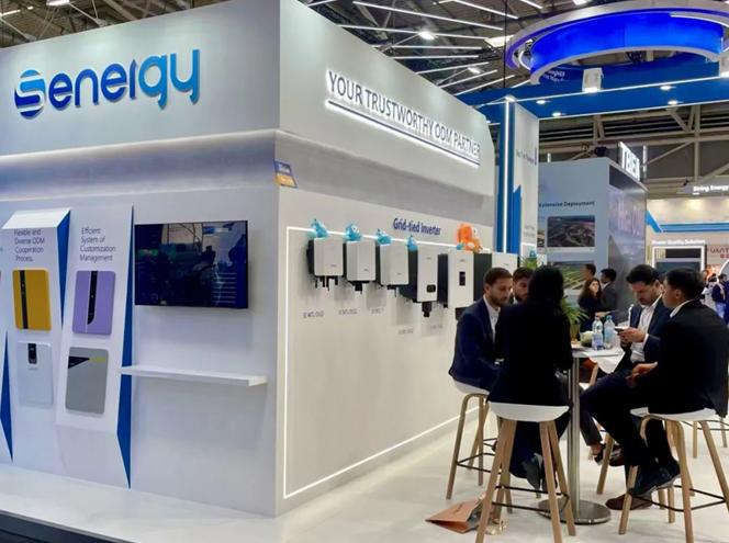 盛能杰展台以科技蓝搭配白色,简洁而不失张力,场景化呈现逆变器系列和储能解决方案: