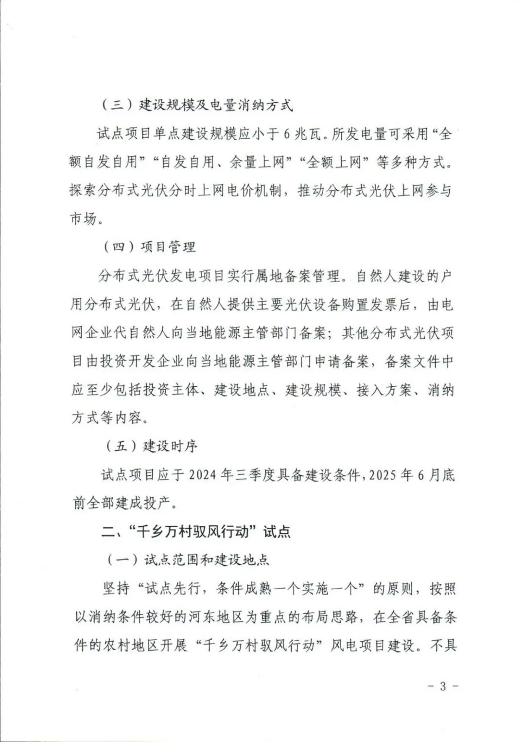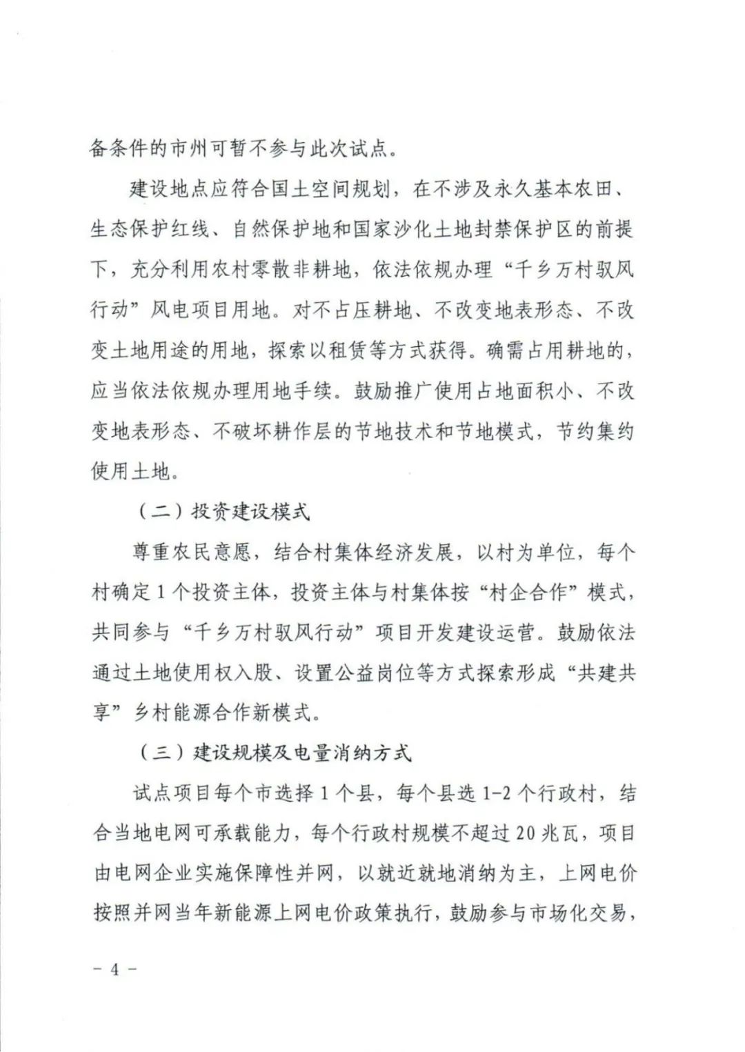 “千乡万村驭风行动”试点同样,每个市选择1个县,每个县选1-2个行政村。结合当地电网可承载能力,每个行政村规模不超过20兆瓦,由电网企业实施保障性并网,以就近就地消纳为主,上网电价按照并网当年新能源上网电价政策执行,鼓励参与市场化交易,参与市场化交易电量不参与辅助服务费用分摊,后续视国家省级政策变化进行调整。