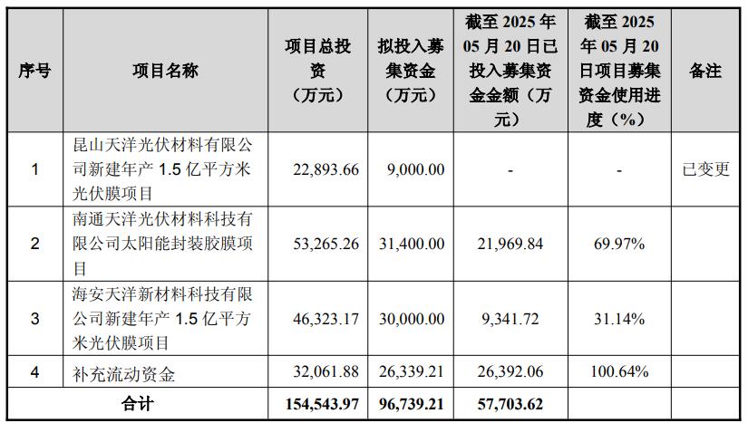 天洋新材决定将募投项目“热熔粘接材料项目”达到预定可使用状态时间由 2025 年 6 月延期至2026 年6 月。“南通光伏项目”及“海安光伏项目”达到预定可使用状态时间由2025 年6 月延期至2026 年 6 月。