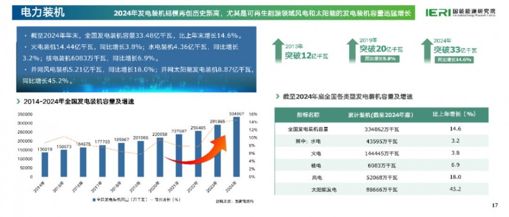 2024年中国电力装机规模再创历史新高,年末全国发电装机容量达33.48亿千瓦,同比增长14.6%。