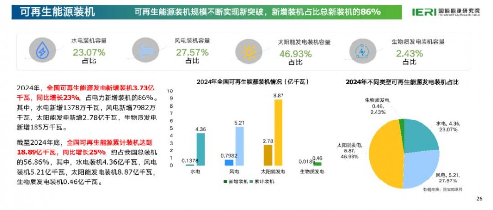 据介绍,可再生能源装机规模不断刷新纪录,2024年新增装机量3.73亿千瓦,占全国总新增装机的86%,占据绝对主导地位。可再生能源新增装机已经连续两年突破了3亿千瓦,占全球新增装机的63.8%。