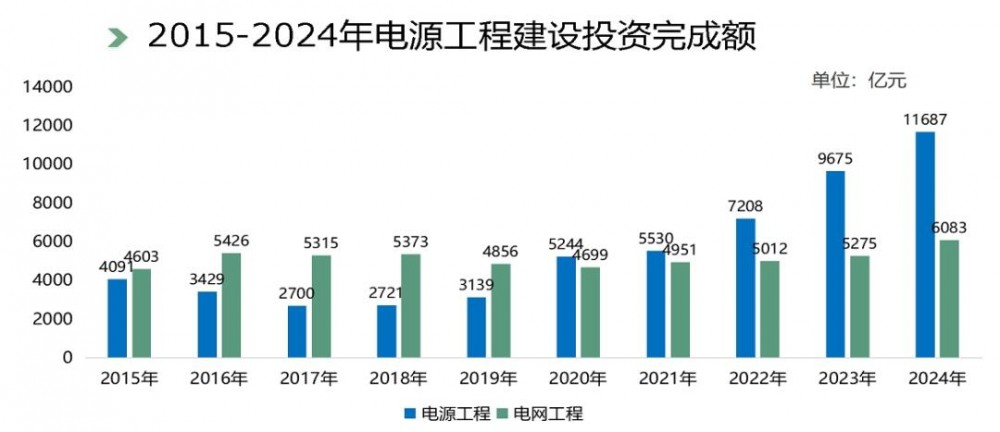在电力基础设施投资建设方面,2024年,中国电源工程完成投资1687亿元,电网工程完成投资6083亿元,水电建设投资1085亿元,核电建设投资1496亿元。