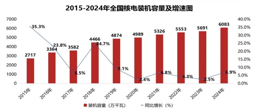核电作为稳定的清洁基荷电源,发展稳健。截至2024年底,全国核电累计装机容量达6083万千瓦,同比增长6.9%,为能源安全和低碳转型提供重要支撑。